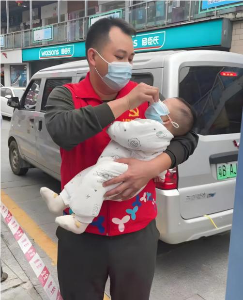 抱着婴儿的这名退役军人叫佘世敏,参与疫情防控前一周刚刚从部队转业,主要负责罗湖区东湖街道布心市场核酸检测采样点的秩序维护工作。在维持核酸检测采样秩序过程中,他发现一名居民单独抱着三个月大的婴儿前来做核酸。为了保障婴儿的安全,他立刻上前予以帮助,轻轻抱起婴儿,并小心翼翼给小宝贝戴上口罩,还细心地调整鼻部松紧,让其更加舒适安全地佩戴口罩,俨然已是一位十分上手的“奶爸”!