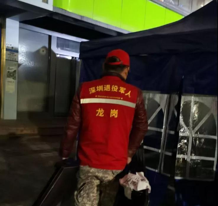 坂田街道红星志愿服务队队长范喜彬以身作则,冒雨通宵奋战,配合街道工作人员安装了3个核酸检测点的设施和37个帐篷、45张桌子、45张椅子,确保了年初一上午10时的核酸检测工作有序开展。邱枫、喻开运、刘展秋、杨少、何杰、沈磊、武宝林等队员从年初一开始就没有休息过,在核酸检测点积极引导待检测人员扫码登记、分区等候、有序排队,用实际行动诠释退役军人的责任和担当。