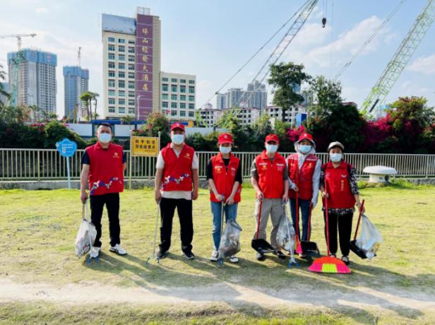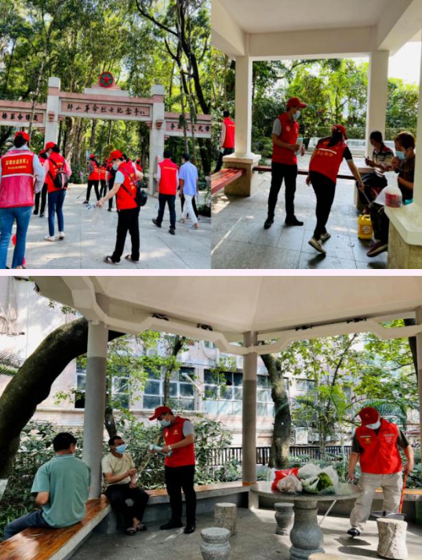 在和平社区党委书记郑若素、副书记谭志好和退役军人服务站站长胡泽森的带领下,红星志愿者在坪山革命烈士纪念亭周边清扫园区内的垃圾、落叶,对不文明行为进行劝导;向不戴口罩的群众现场派发口罩,引导群众强化“每个人是自己健康第一责任人”理念。
