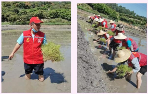 4月10日、11日两天,红星志愿者们身穿红马甲到农田里集合,简单分工之后,他们撸起袖子,纷纷行动起来,有的拿铁锹、有的搬秧苗、有的插秧苗……暖阳下一派春耕繁忙的景象。插秧过程中,大家弓着腰,身上都被泥水弄脏了,有的人不小心手机钱包也掉进田里,工作热情却丝毫不减,仍开心地互相击掌。