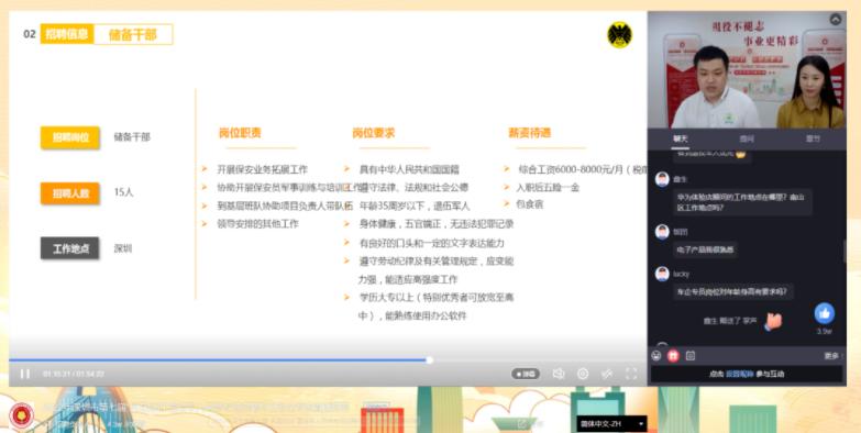 招聘月活动中,直播带岗的火热开播无疑成了链接招聘企业和退役军人最直接有效的桥梁。招聘月期间,主办方先后举办了2场直播活动,吸引了鑫辉餐饮、东誉保安、警通实业、深高速、中国人寿、百胜中国等多家深圳市退役军人就业创业联盟成员单位及优质名企参加,为退役军人带来近400个就业岗位,岗位涵盖主管、工程师、技术员、管理员、检验专员等不同类别的工种。