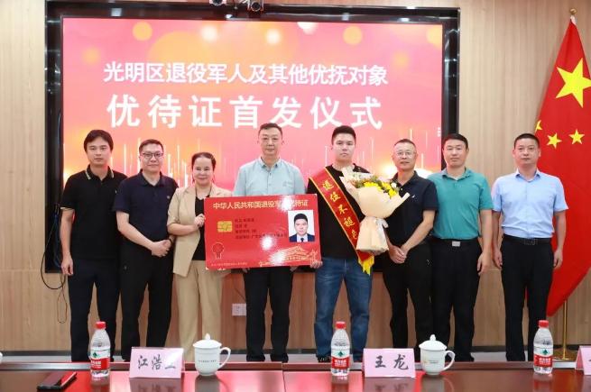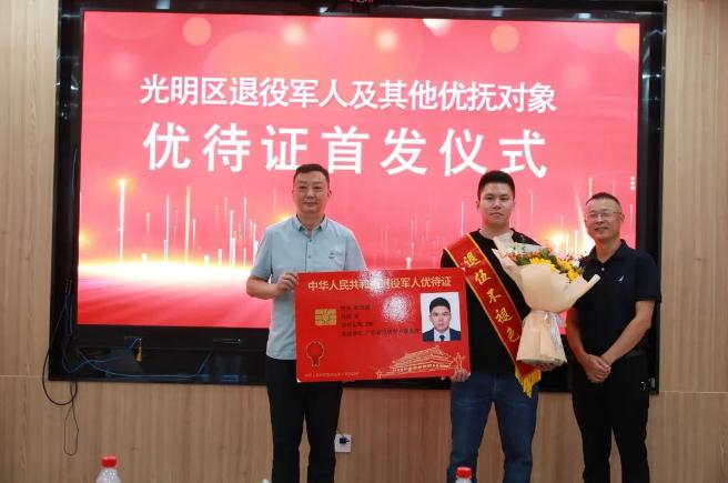 8月3日,深圳市光明区退役军人事务局协同中国农业银行光明支行举行光明区首张退役军人和其他优抚对象优待证发放仪式。光明区退役军人事务局、凤凰街道、中国农业银行光明支行等多家单位有关负责同志参加仪式。