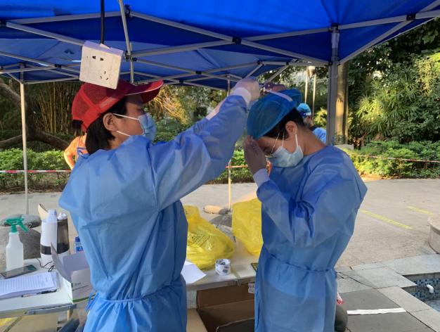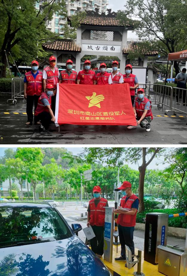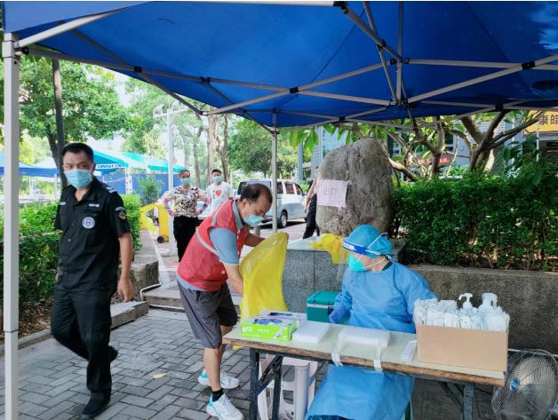 在参与社区防疫工作的过程中,也涌现了很多感人的抗疫故事。周伟明是蛇口街道渔二社区的一名老党员,同时也是一名参战老兵,曾经的他在战场上与敌人殊死搏斗,如今他坚毅地再次踏上一场无硝烟的战场与病毒零距离博弈,无论烈日或风雨,他每天都坚守在社区防疫卡口值守。南头街道退役军人红星志愿者刘琼,连续20多天参加社区核酸采样点的志愿服务,并且还带领18岁的女儿也投身到疫情防控志愿中。桃源街道龙辉社区的皮建锋则与妻子并肩作战,连续3个月“扎”进社区的核酸采样点参加志愿服务。