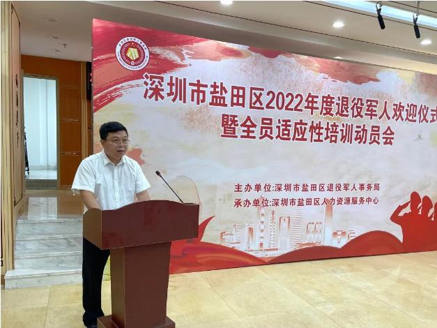为帮助辖区退役军人顺利转换角色、更快融入社会、更好地实现自身价值,近日,深圳市盐田区退役军人事务局在盐田区人力资源大楼隆重举行了“盐田区2022年度退役士兵欢迎仪式暨全员适应性培训动员会”。区退役军人事务局局长张远飞、副局长王伟东、退役军人服务中心主任卢伟,各街道退役军人服务站负责人及26名退役士兵参加了活动。