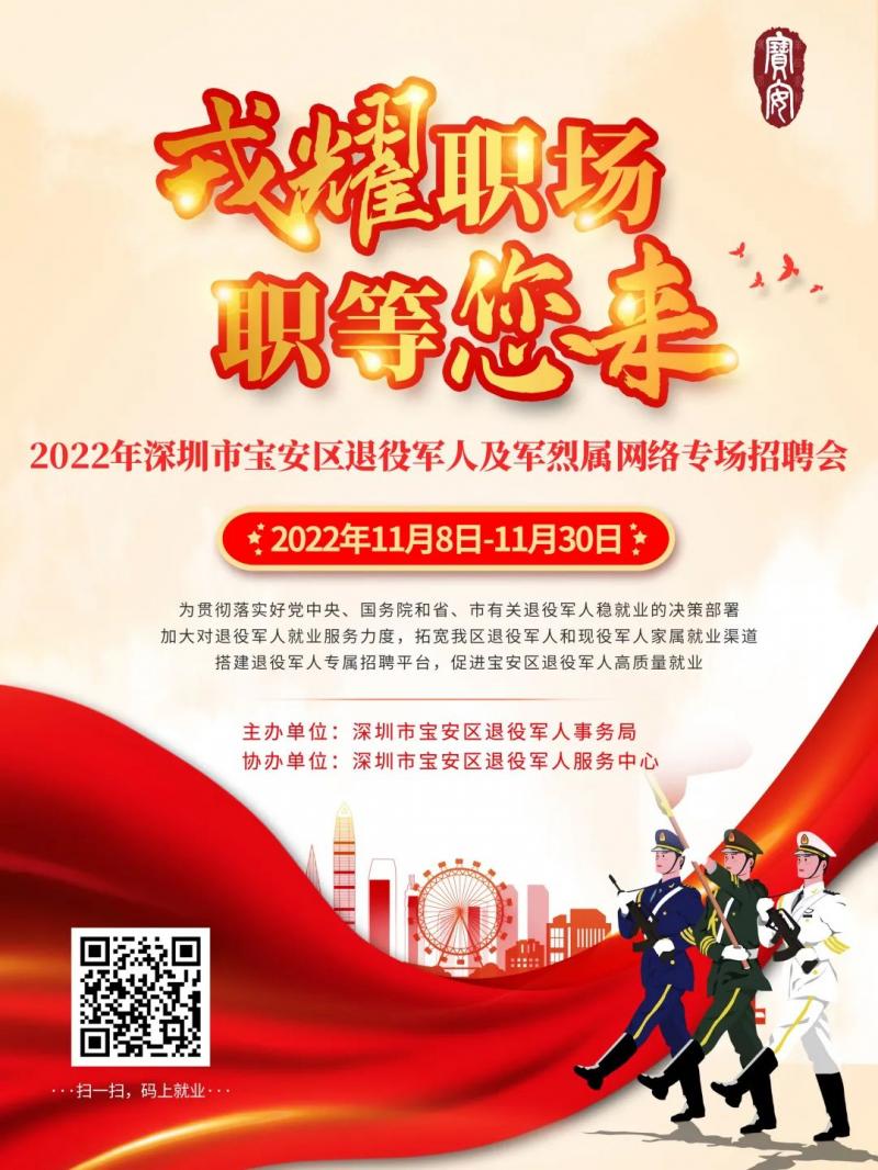 11月8日,深圳市宝安区退役军人事务局组织开展2022年第二期退役军人网络专场招聘会,为广大退役军人就业提供良好平台,活动持续至11月30日。