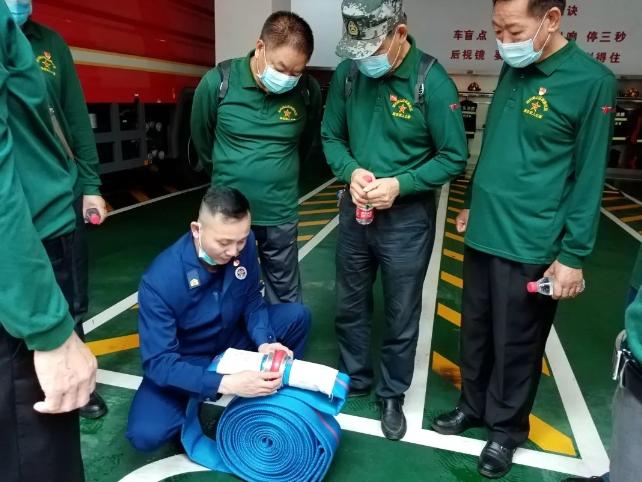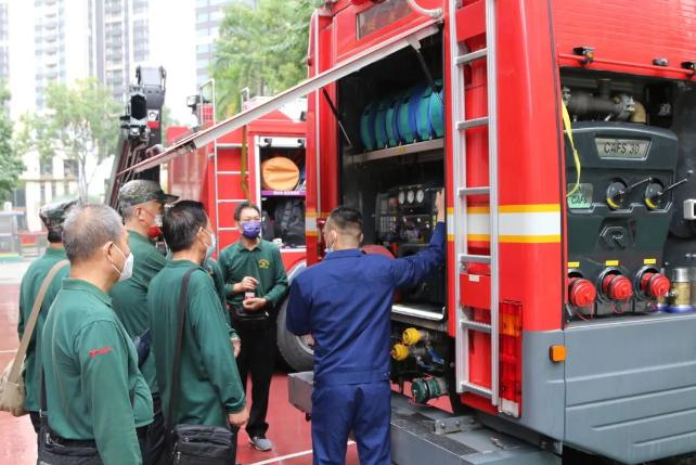 活动伊始,书记工作室主要牵头人、龙辉社区退役军人党支部书记林刚向塘朗消防救援站驻地官兵介绍了“老班长”书记工作室的愿景目标、成员构成和相关活动安排。塘朗消防救援站站长盛鹏刚为工作室学员讲解了站内消防员出动消防车的相关纪律、火灾基本常识、防火及火场紧急逃生等应急知识。站内消防员现场示范了消防车水枪举高喷射、水带消防栓装卸、消防车水压控制器调节等消防装备的操作过程,并邀请学员进行实操练习。