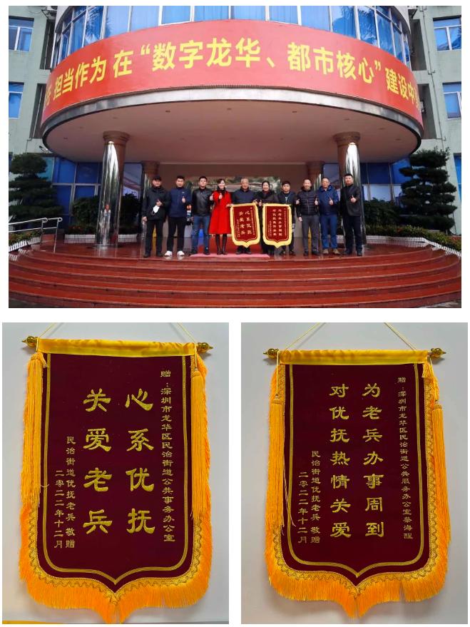 12月14日下午,龙华区民治街道优抚对象代表吴震等一行人到民治街道办送上“心系优抚 关爱老兵”“为老兵办事周到 对优抚热情关爱”两面锦旗,表达优抚对象诚挚的谢意,充分肯定民治街道退役军人事务工作。民治街道公共服务办负责人邓梅、街道退役军人服务站站长罗镇彪热情接待了优抚对象代表,表示民治街道将继续做好退役军人和优抚对象服务保障,为优抚对象和退役军人多做实事、办好事。