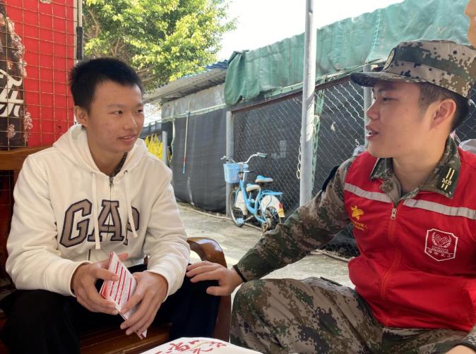 在应届大学生家中,宣传组与适龄青年及家长面对面交流,详细了解他们的身体状况、在校表现、人生理想、参军意愿等基本情况。退役老兵钟耀辉还向适龄青年分享了自身入伍以及在部队生活、训练的经历等。